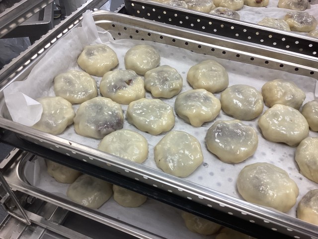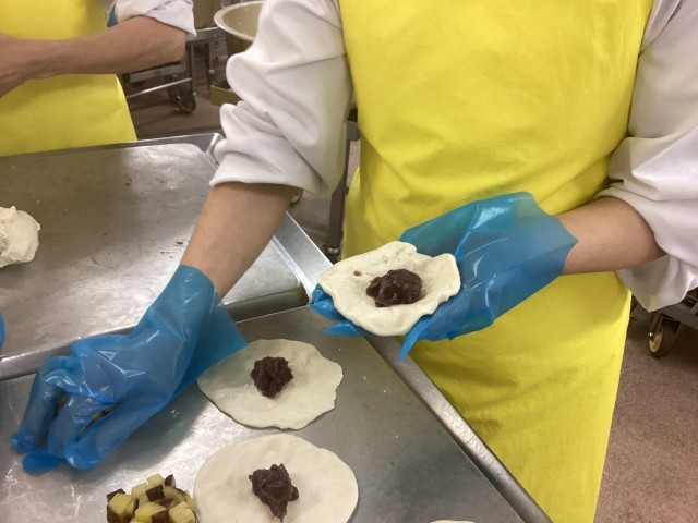 今日は熊本県の郷土料理献立です。いきなり団子は、さつまいもとあんこを平たく伸ばした生地で包み蒸して作ります。来客が「いきなり」来ても、短時間で作って出せるので、いきなり団子という名前がついたそうです。
