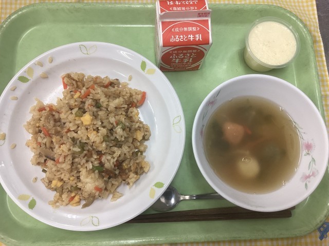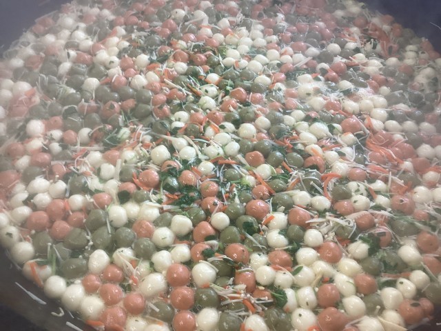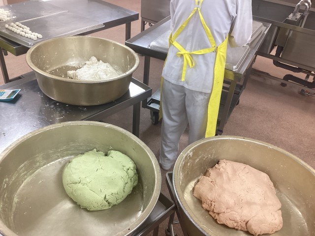 今日はひなまつり献立です。女の子の成長や幸せを願う行事で、別名「桃の節句」ともいいます。三色白玉汁は、菱餅をイメージして、桃色、白色、緑色の三色の白玉が入っています。桃色はトマトペースト、緑色は抹茶を使って色付けしました。