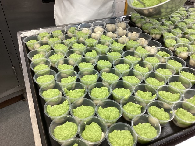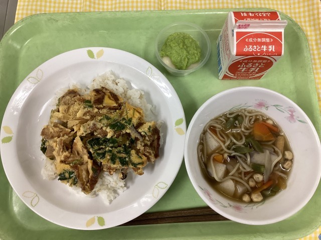 東日本大震災から14年が経ちました。給食でも応援の思いをこめて、被災地の一つである宮城県の郷土料理を取り入れました。とよま丼は、宮城県の名物「あぶら麩」を似て卵でとじたものをごはんにのせたものです。ずんだもちは、すりつぶした枝豆で作った餡を白玉もちにからめた宮城県の郷土菓子です。