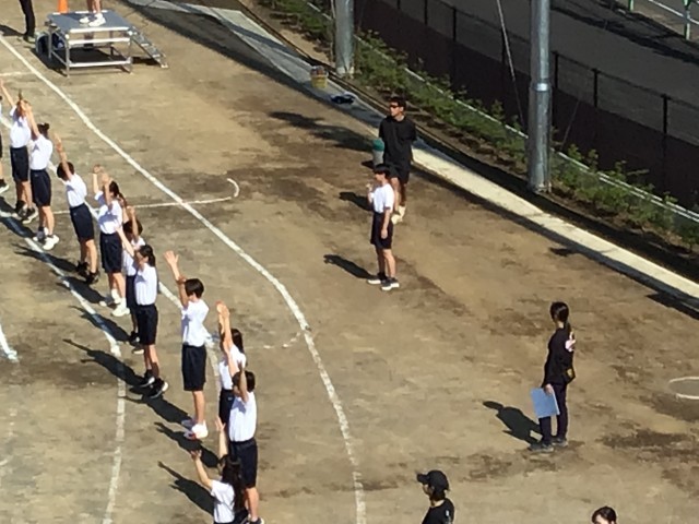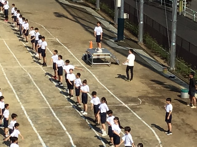 今日は全校で、ラジオ体操と退場の練習と応援席の確認をしました。