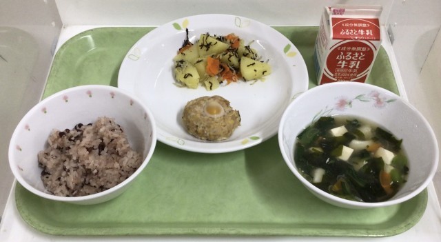赤飯、鶏肉のつくね蒸し、しらすのりじゃが、白身魚のすまし汁、牛乳です。