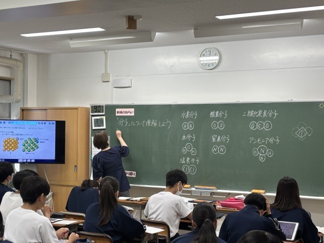 ICT機器の映像、黒板の図、言葉という様々な方法で教科担当の先生が分子について説明していました。