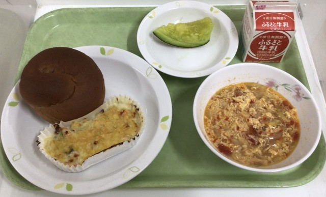 ココアパン、新じゃがとアスパラ米粉グラタン、アクアコッタ、メロン、牛乳です。
