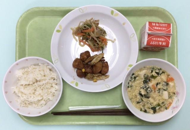 【かみかみ献立】玄米ごはん、豚肉とごぼうの揚げ煮、こんにゃくサラダ、かきたま汁、牛乳です。