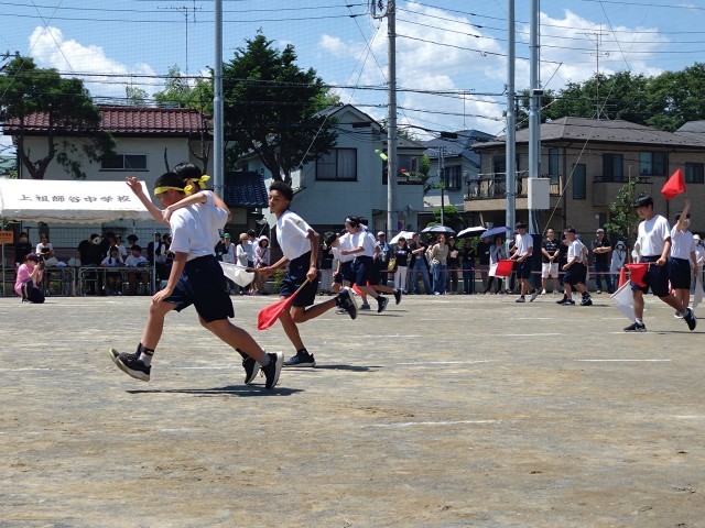 紅白の旗をもって、監察係の生徒も、隣を伴走しています!
