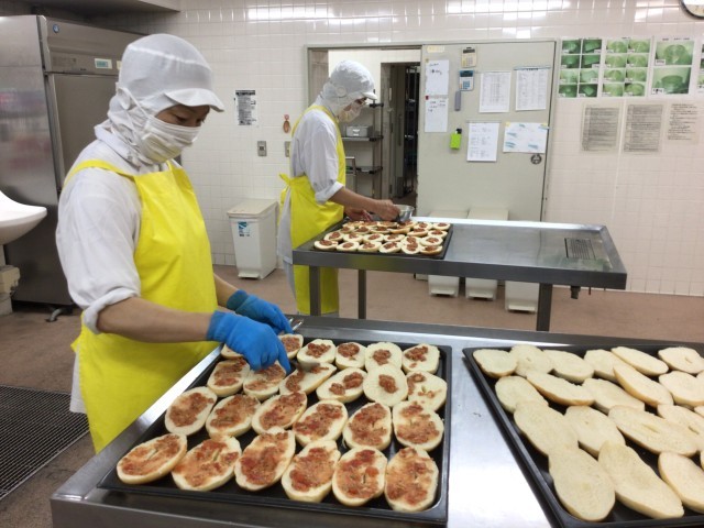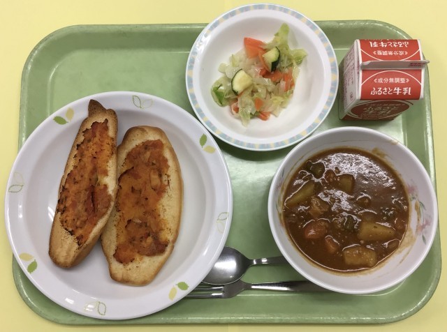 給食では、ソフトフランスパンにオリーブオイル、にんにく、トマト、ツナを