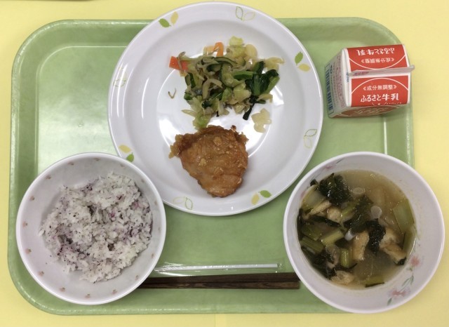 ゆかりごはん、鶏肉の香味焼き、カリカリじゃこサラダ、冬瓜のすまし汁、牛乳です。