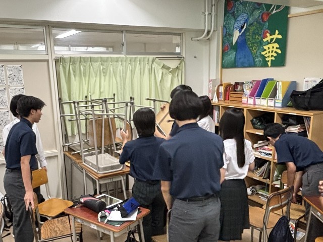 3年生は、まず前後のドアを、誰かが指示をすることなく、自然と二手に分かれ、ドアの窓等が割られた時の対応のために、まずカーテンを閉め、すぐに机、椅子を組み合わせ、しっかりとしたバリケードをドア付近に素早く作っていました。