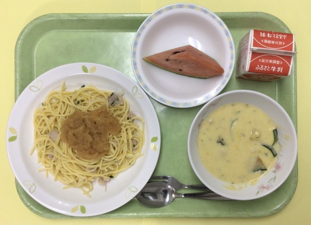 おろしスパゲティ、野菜のポタージュ、小玉すいか、牛乳です。