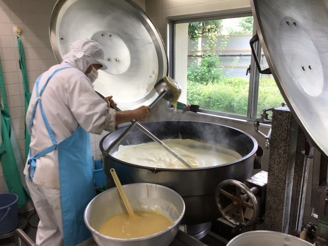 今日の野菜のポタージュをはじめ、シチューやクラムチャウダーなどを作る際に、おいしさのポイントとなるのがホワイトルウです。給食では、薄力粉、バター、油を炒め合わせて、ホワイトルウを手作りしています。
