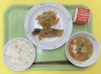 高菜めしには本来は阿蘇高菜を使用しますが、給食では手に入らないため、高菜漬けを使いました。