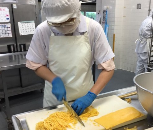 今日の主食は、暑い日にぴったりな冷やし中華です。錦糸卵は天板に卵を薄く流して、コンベクションオーブンで焼き、丁寧にカットして作りました。タレや野菜、麺も加熱後によく冷やし、暑い日にぴったりな冷やし中華が出来上がりました。