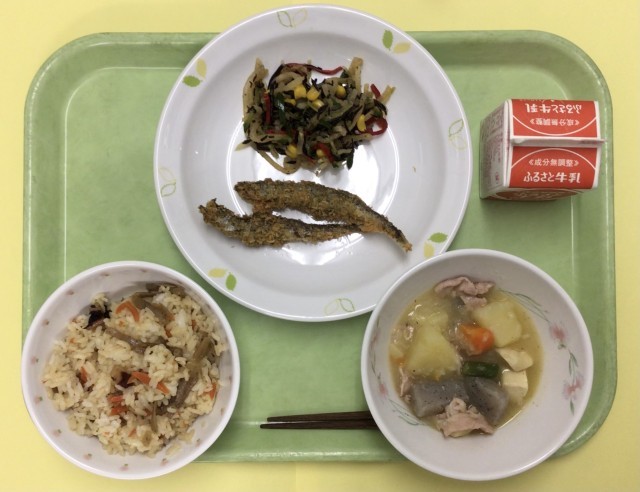 たこめし、ししゃもの青のりフライ、大根とひじきのサラダ、塩肉じゃが、牛乳です。