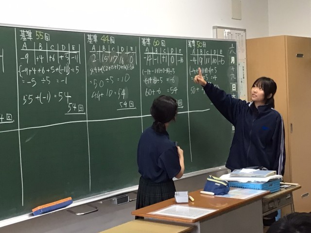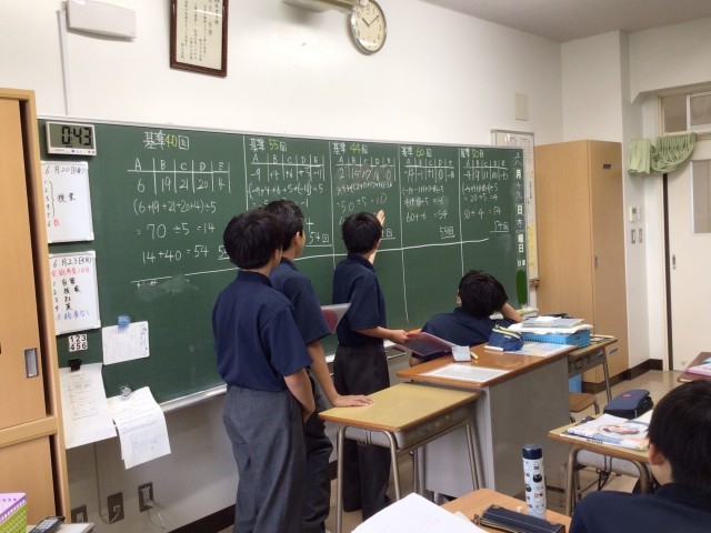 数学の授業では、平均を求めるときに基準を決めて仮平均を利用して簡単に求められるようになろうという授業を行いました。