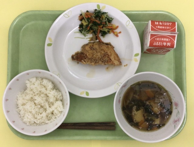ごはん、鮭の照りごま揚げ、水菜の辛子風味和え、鶏ごぼう汁、牛乳です。