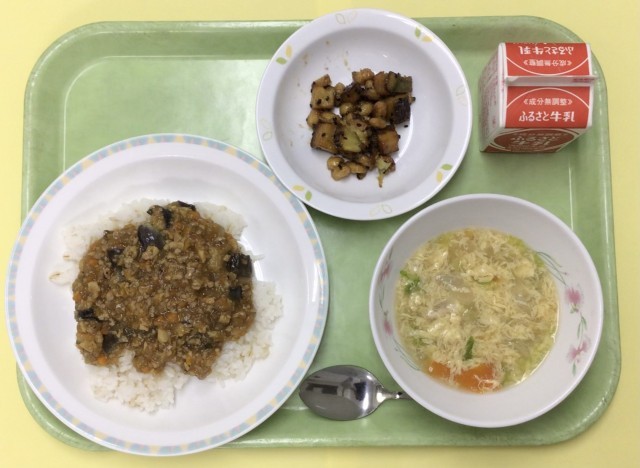 麻婆なす丼、卵とレタスのスープ、お豆かりんとう、牛乳です。
