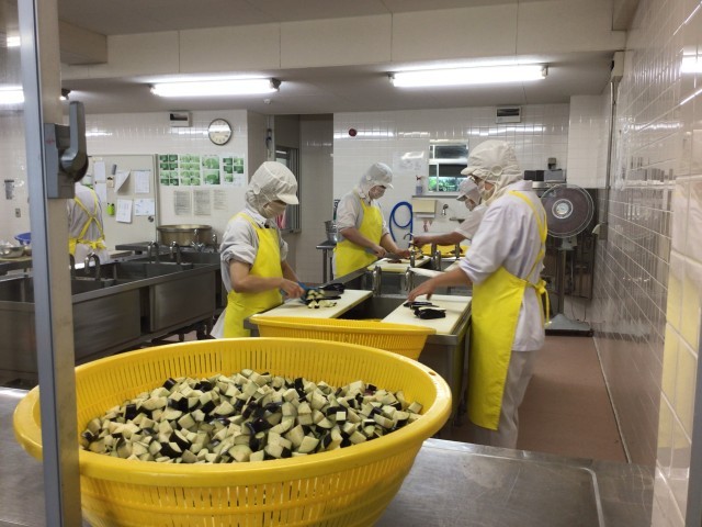 今日は旬のなすをたっぷり使って、麻婆なす丼を作りました。なすは全校分で30キロもありましたが、