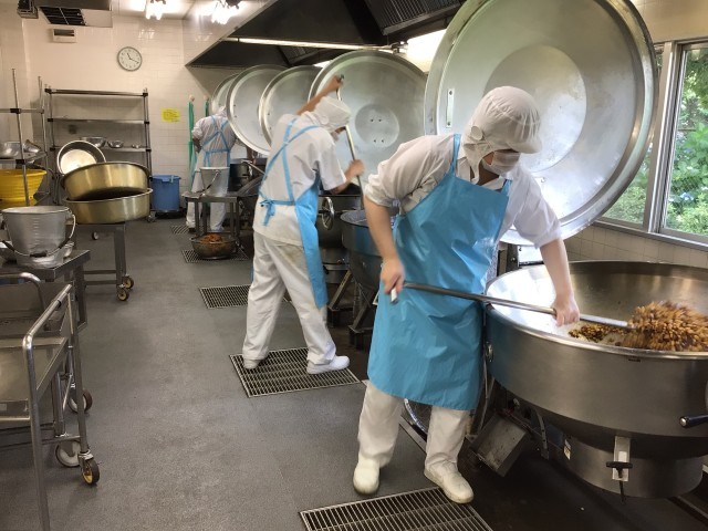 釜の前は暑くて、立っているのもしんどい日がありますが、美味しい給食を提供できるよう、日々頑張っています!