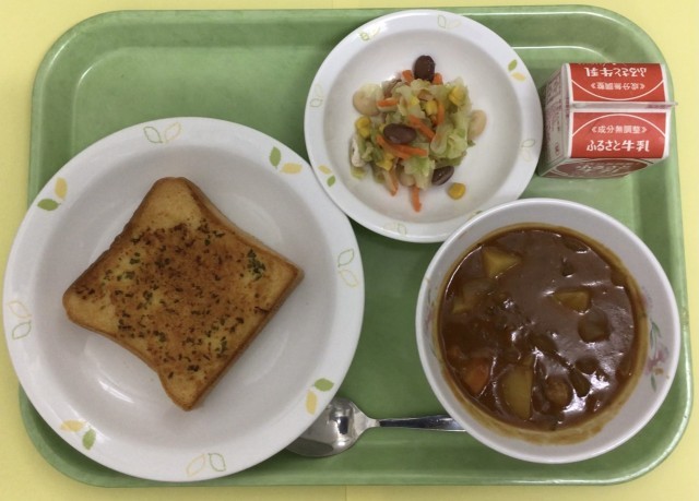 ガーリックトースト、トマトシチュー、豆のサラダ、牛乳です。