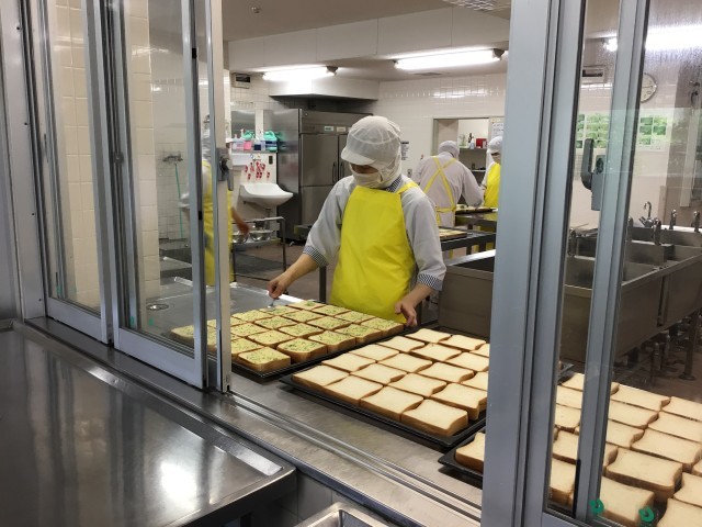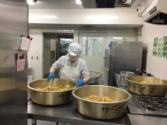 3枚目の写真は、サラダのドレッシングを和えているところです。給食ではドレッシングも手作りです。