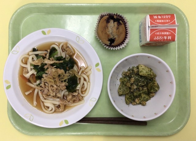 冷やしきつねうどん、青のりポテトビーンズ、ブルーベリーマフィン、牛乳です。