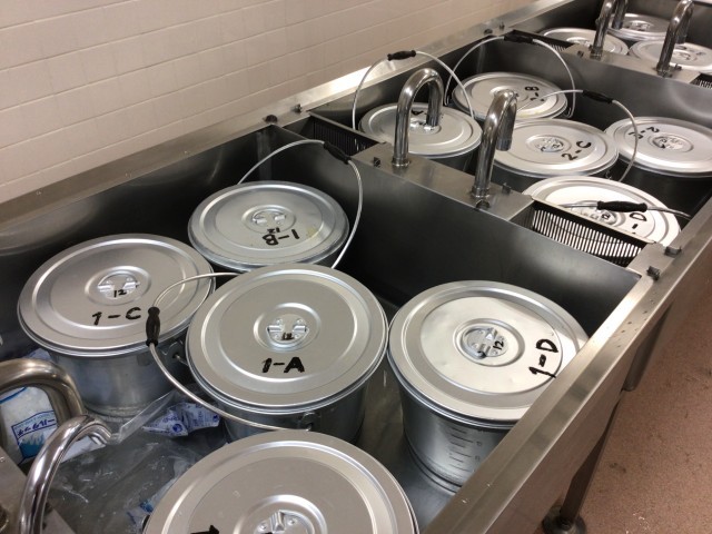 写真2枚目はうどんのつゆを冷やしているところです。1クラスずつ食缶に配缶した後、
