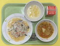 【献立】スパゲティきのこソース、タラのブイヤベース、アップルポンチ、牛乳
