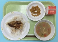 【献立】豚肉とコーンのピラフ、魚のバーベキューソース、豆乳チャウダー、牛乳魚は旬...