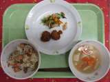 <献立> ・アメノイオごはん ・大豆とひじきのつくね揚げ ・水菜の辛子風味あえ ...