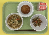 【献立】カレーうどん、こんにゃくサラダ、ごまマドレーヌ、牛乳ごまマドレーヌは、バ...