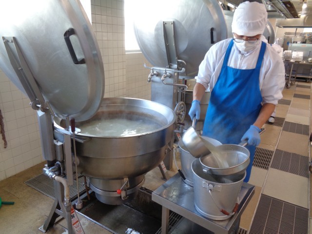 ソトアヤムに使う鶏ガラスープを計量しています。