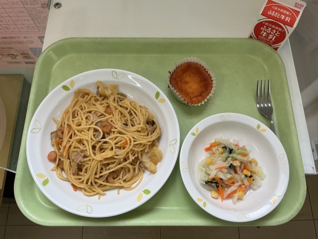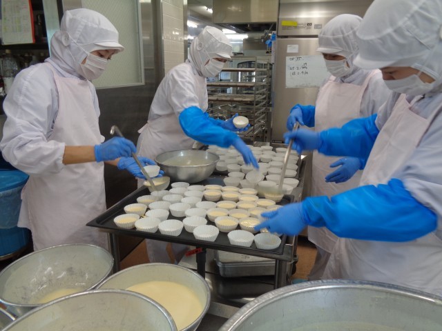 給食室で手作りした生地をレードルやお玉を使って、慎重にカップに流しています。
