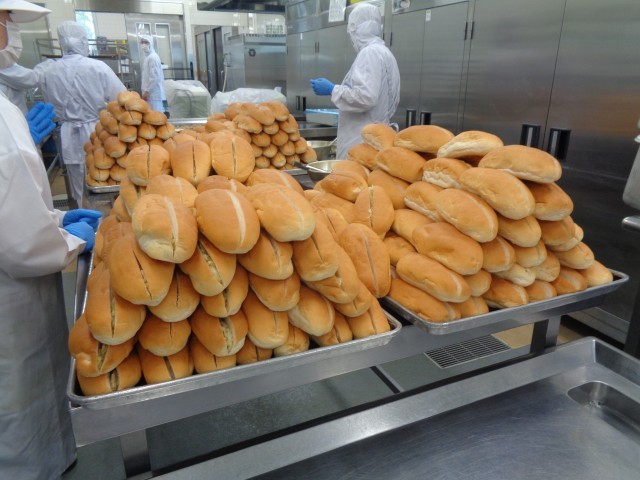 給食室でカットしたパンにキャベツをはさんで、次の作業までの待機中。