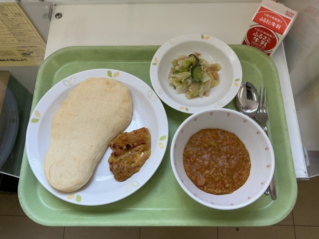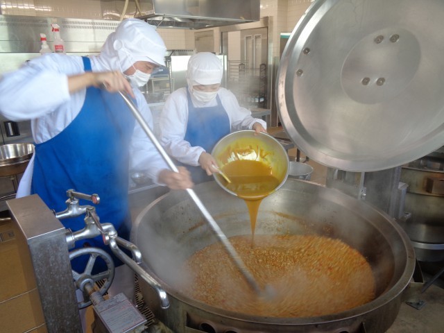 給食室では油、薄力粉、カレー粉を合わせてルウを作っています。