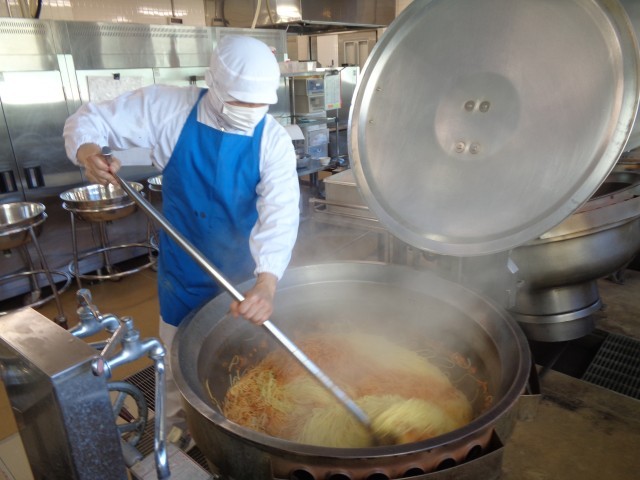 先にソースを作り、炒める回数分に分け、ゆでたスパゲッティとソースを回転釜で炒め合わせます。