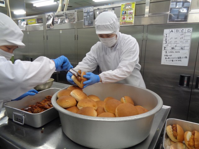 切り込みを入れた丸パンにキャベツをはさんだ後に、ソースをかけた魚のフライをはさみます。