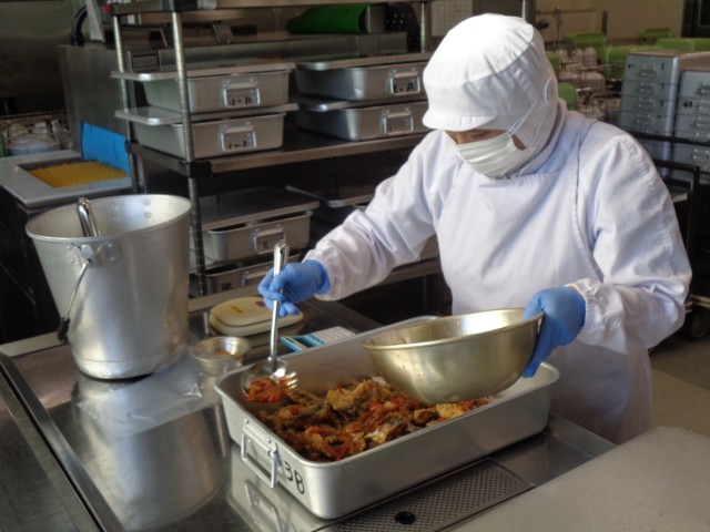 タレや野菜がなるべく均等にかかるように丁寧にかけています。