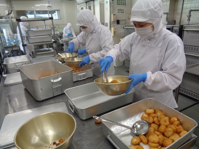 揚げたいももちをボウルに入れたタレに1つ1つ絡めて、数を数えながらバットに入れています。
