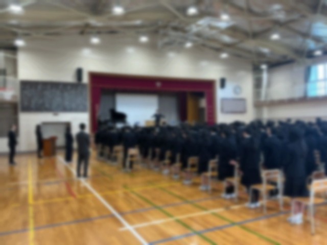 本日、令和8年度着任式・始業式を行いました。明日は、新入生を迎えての入学式です。2・3年生は、入学式に向けて、心をこめて校歌「一千億光年」を歌いました。