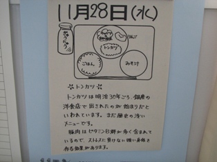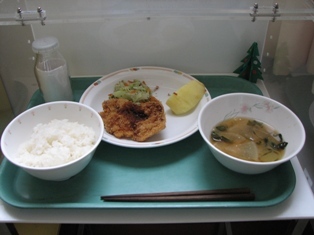 給食のメニューはトンカツでした。小松菜を早速、みそ汁に入れておいしくいただきました。