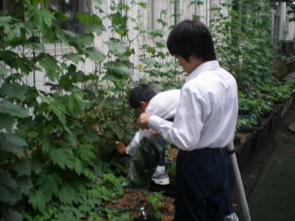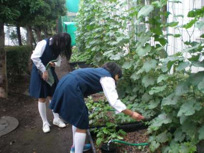 校舎南側に設置している「グリーンカーテン」。今年は天候がよいためか、たくさんのきゅうりが育ってきたため、2年生でボランティアをつのって収穫をしました。5分ほどで採れたきゅうりは18本!明日の給食に使っておいしくいただきます。