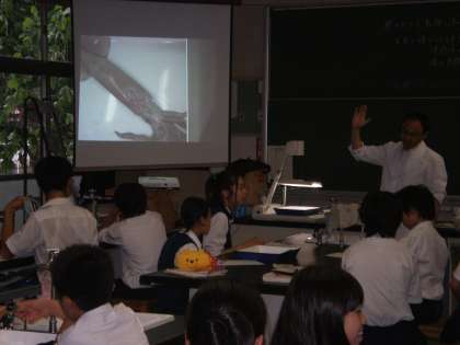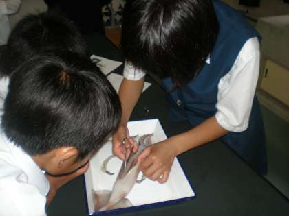 2年生の理科の授業で、イカの解剖が行われました。環境教育の一環として、生命尊重に関する内容も含め、イカのからだについて学習いたしました。