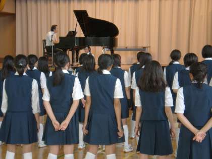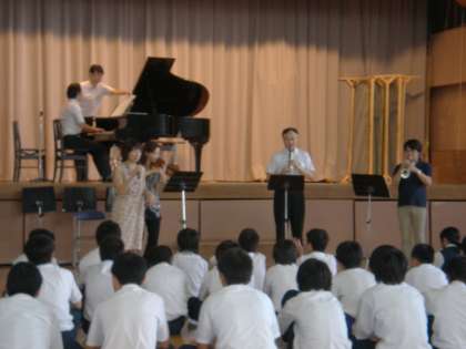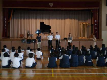 楽器演奏者を招いて、楽器紹介や校歌の指導を受けました。