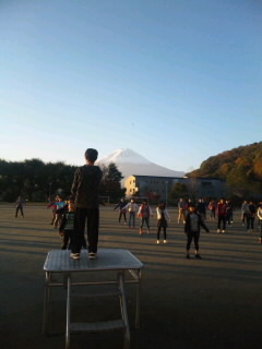 きれいに晴れ、富士山がはっきりと見える園庭 で体操です