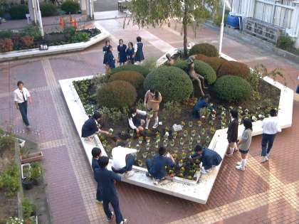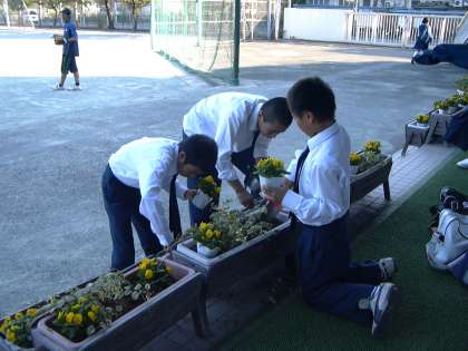13日(火)美化委員とボランティア生徒による「花いっぱい活動」が行われました。中庭や玄関前にパンジーとビオラを植えました。活動に参加した生徒のみなさん、お疲れ様でした。