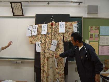 14日校内研修会において、2年A組の研究授業が行われました。単元は、教科「日本語」の日本文化「着る」、指導者は島田教諭、水田教諭でした。着物の特徴を理解することがねらいでした。生徒たちは実際の着物に触れ着物の名称や、着物にかかわることばについて学んでいました。講師の先生からは、生徒達が積極的に取組んでいる様子がよかったとお褒めのことばをいただきました。