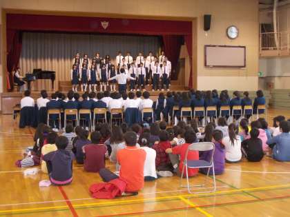 10月15日(水)、9年教育の取り組みの一環として、小松菜の受け渡しと3年生の合唱練習見学が行われました。雨の中を小学6年生が来校し、小学生が育てた小松菜を中学生が受け取りました。その後、小学生は、3年生の合唱練習を見学し帰校しました。