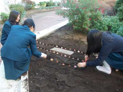 11月4日(火)、ボランティア部の3年生が、中庭にチューリップの球根を植えてくれました。色鮮やかに開花する日を楽しみにしています。