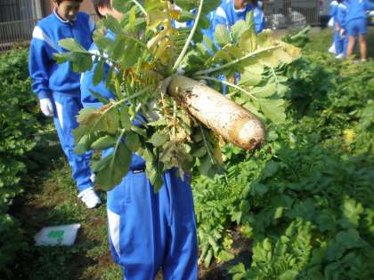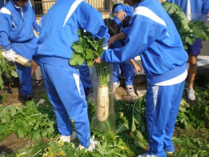 毎年行っている1年生の農業体験「大蔵大根づくり」も収穫の日を迎えました。11月には、1年A、B組、12月8日には1年C組がそれぞれ収穫しました。大根は、家に持ち帰り、おいしく頂いたことでしょう。畑を提供してくださっている原田さん、お世話になった農協の方、そして、色々教えていただいた永井さん、ありがとうございました。また、畑のご近所の方々にはご迷惑をおかけいたしました。喜多見まちづくりセンターに、収穫した大根を展示していただきました。