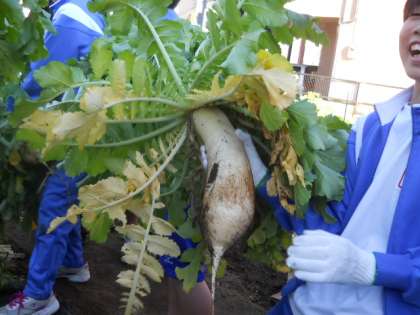 12月2日(火)、待ちに待った大蔵大根の収穫となりました。今年は、大豊作となりました。自分たちが育てた大根を、うれしそうにいっぱい持って帰りました。農家の方々、今までありがとうございました。
